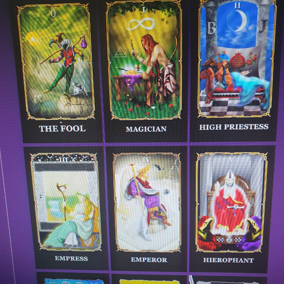주요 아르카나 카드의 표면은 1/4인치 검은 테두리로 안쪽 테두리는 옅은 금색입니다. 아르카나 소령의 카드 번호는 선두에 흰색 로마 숫자로 둘러싸여 있습니다. 카드 제목은 아래에 하얀 글씨로 적혀 있습니다. 각 화상은 마치 액자에 들어가 있는 것처럼 표시됩니다.