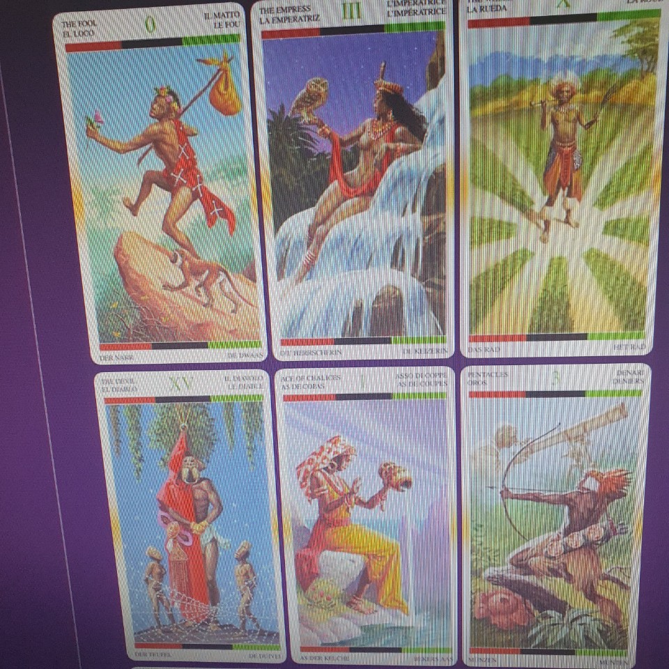전통: 전통적인 타로 구조가 답습되어 서양문화의 신비로운 상징은 아프리카 기원의 상징으로 대체됩니다.